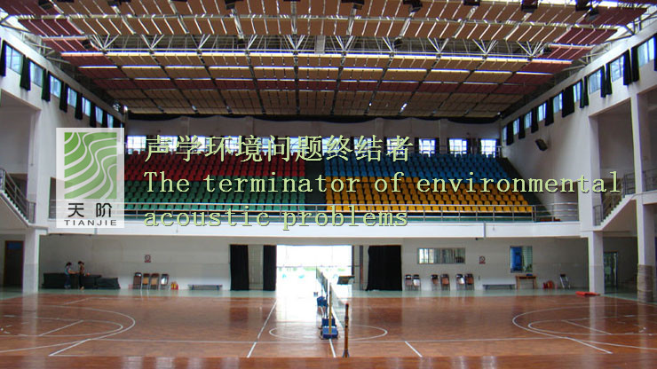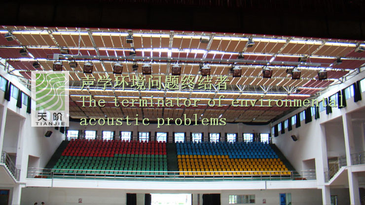東莞中學(xué)體育館采用的是空間吸聲體。空間吸聲體是一種懸掛在頂棚具有高效吸收性能的吸聲材料。空間吸聲體一般水平或者垂直吊掛??臻g吸聲體面積占頂棚面積30%-40%時(shí)其材料的吸聲性能是其他聲學(xué)材料吸聲性能的2倍。