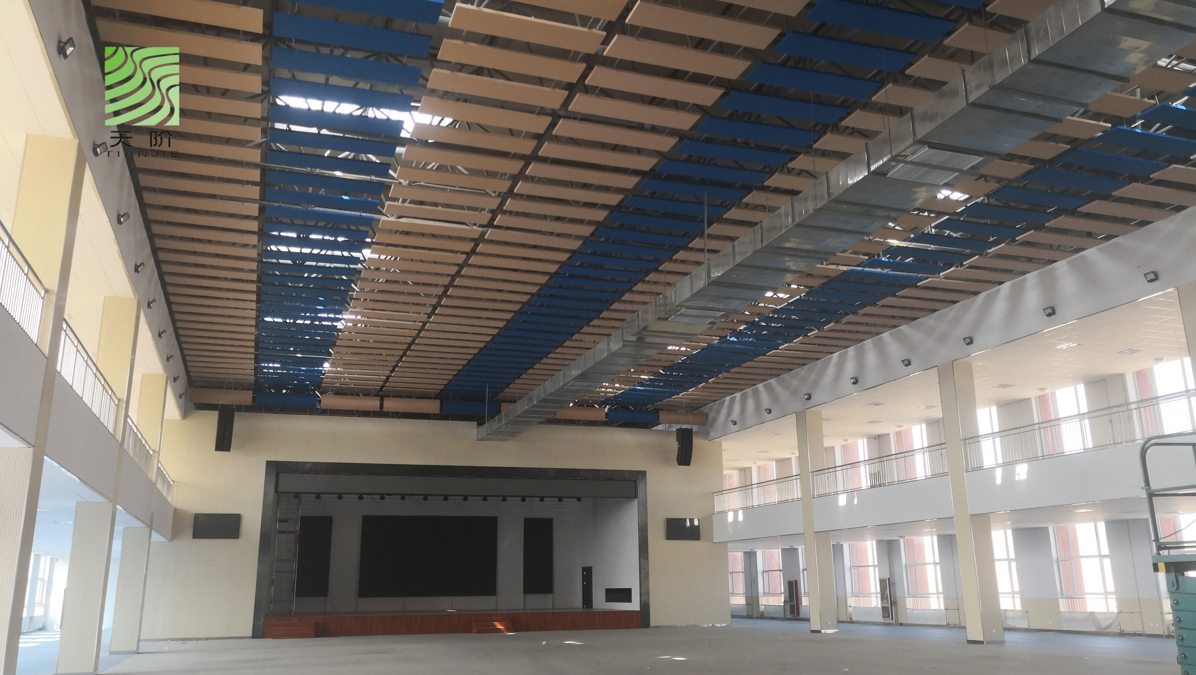 ⒌近年較常見的做法是采用事先經過測試的空間吸聲體(預制件),順著網架的形狀吊掛于棚頂。可以達到比較良好且較精確的吸聲效果。類似方法曾用于廣東中山古鎮體育館、肇慶學院體育館等場館,效果良好。這個方案不會過分影響建筑風格,如果對空間吸聲體的造型和色彩適當組合搭配,還會有一定的美化效果。