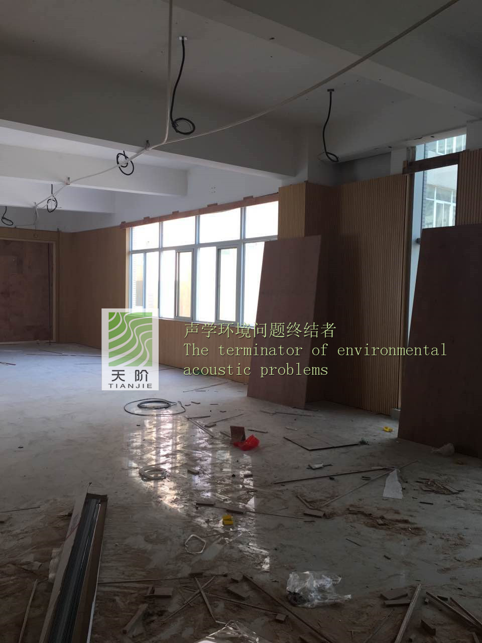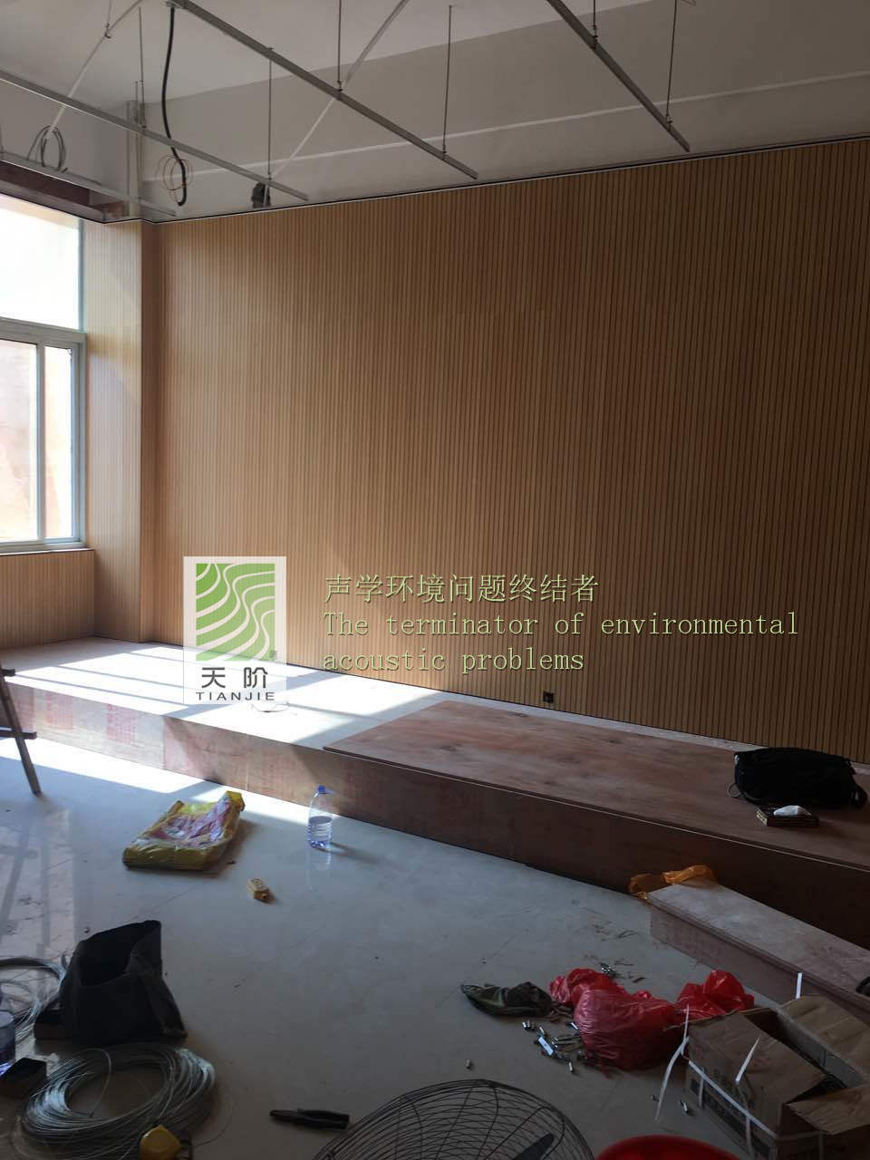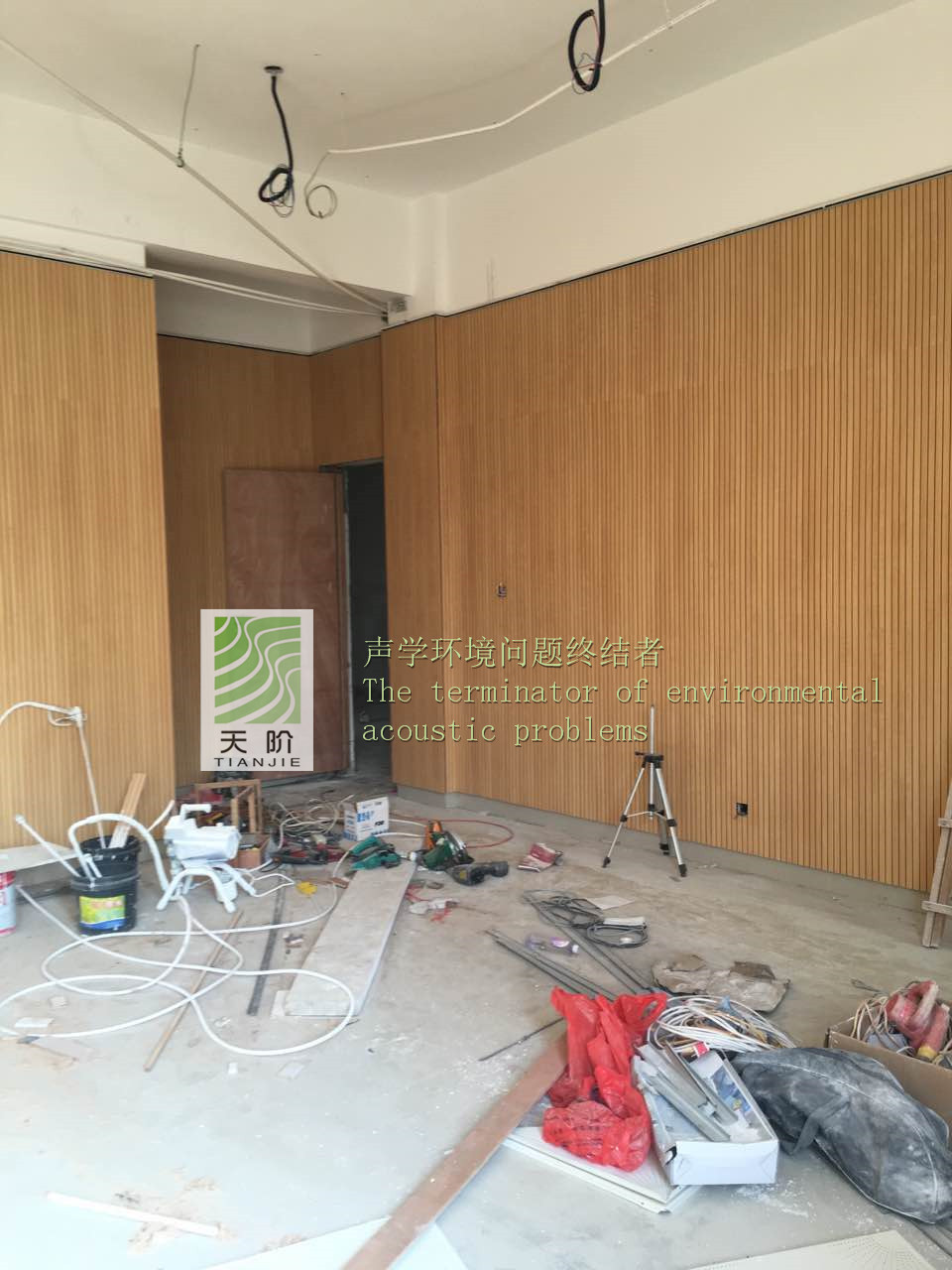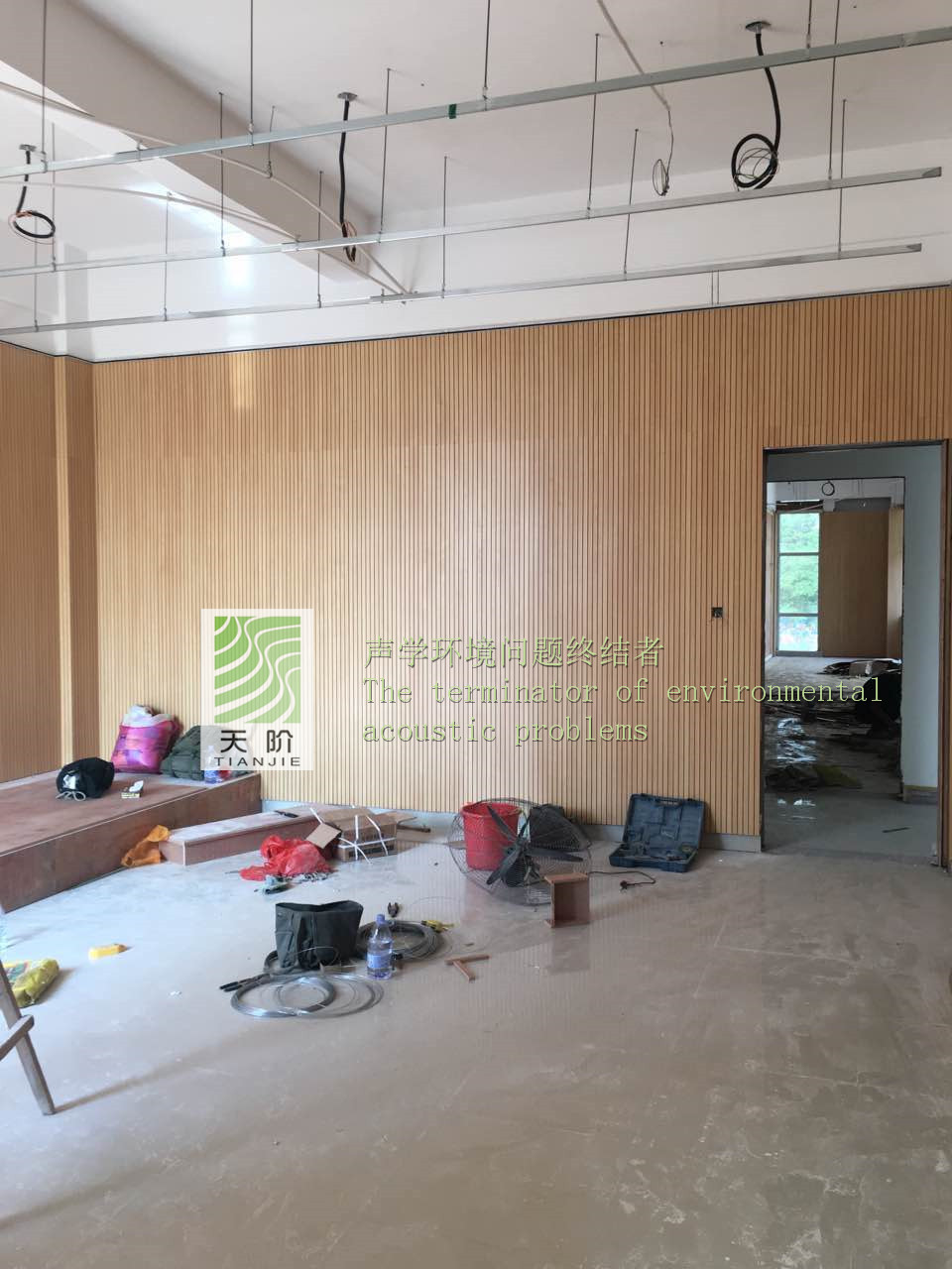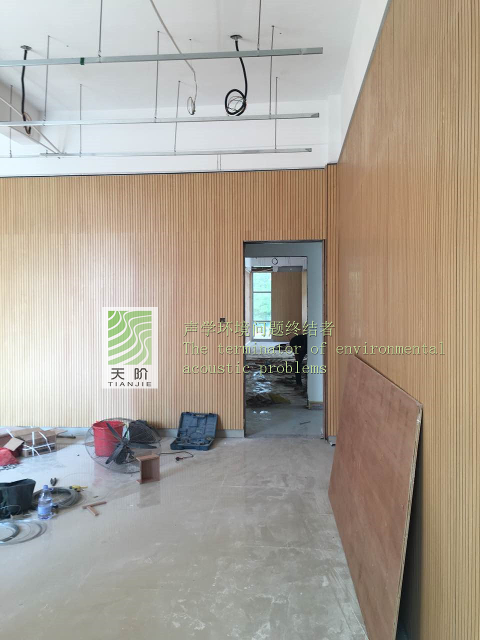 福建省泉州市惠安縣政府對青少年宮非常的重視,特地邀請了專家對舞蹈室、鋼琴室、教室進行了吸音設計。教室的聲學設計應以語言清晰度為主,教室的混響時間長短、背景噪聲、響度對語言清晰度影響最大。不同大小的教室,對混響時間長短的要求會有所不同。教學場所要求較高的語言清晰度,需要較短的混響時間,可以通過室內選用合理的吸音材料和現場裝修布置達到。室內墻面是聲學裝修時面積最大可供利用的表面,所以決定在四周的墻面上安裝槽木吸音板,此時使用了我們天階牌的槽木吸音板共2000平方。
