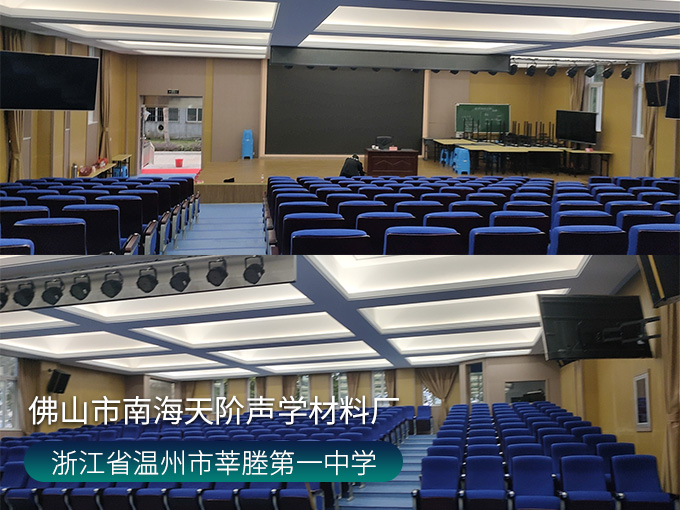 浙江省溫州市瑞安市農(nóng)場(chǎng)村莘塍第一中學(xué)會(huì)議廳項(xiàng)目,墻面使用穿孔吸音板,基材選用不燃堅(jiān)硬的玻鎂基材,飾面選用溫和的色調(diào)。整齊穿孔吸音板,吸音效果顯著,能吸收活動(dòng)期間的噪音,回聲。