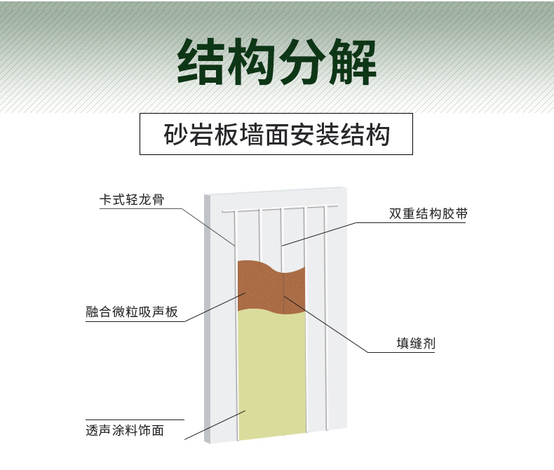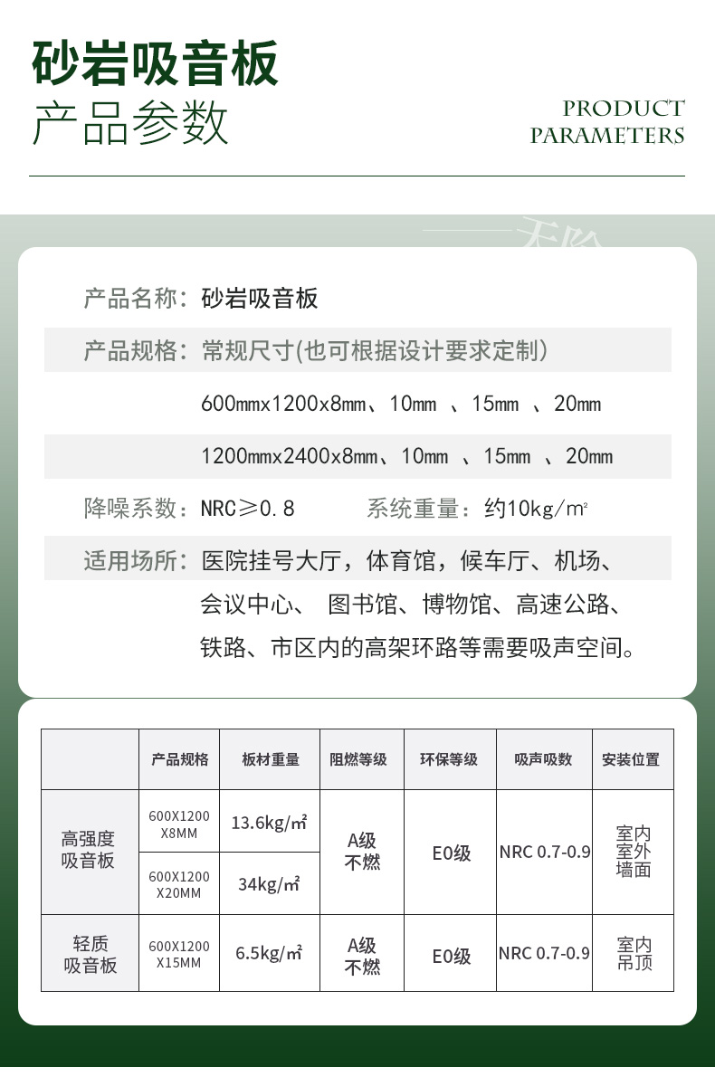 砂巖吸音板,它的基材有兩種,一種是具有吸聲防火**的強化玻纖板為基材,這種基材為大家所熟知,也是很多設計師慣用的一種高端吸聲材料;另外一種基材是由特定直徑的輕質砂粒為原料,通過聚合技術使每個顆粒之間如焊接般聚合在一起,由于無機顆粒的表面不規則形狀或聚合空隙,微粒之間形成了大量不規則且互相連通的微觀孔隙結構。