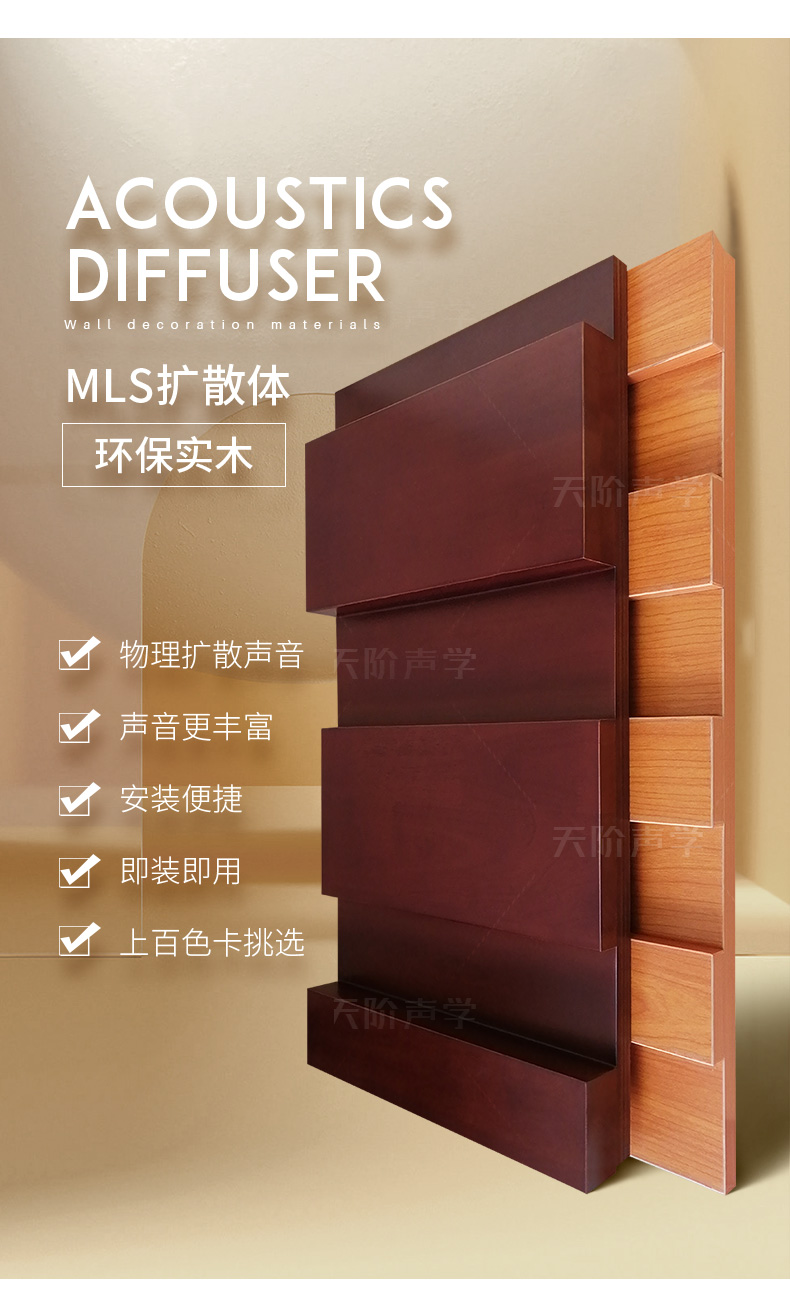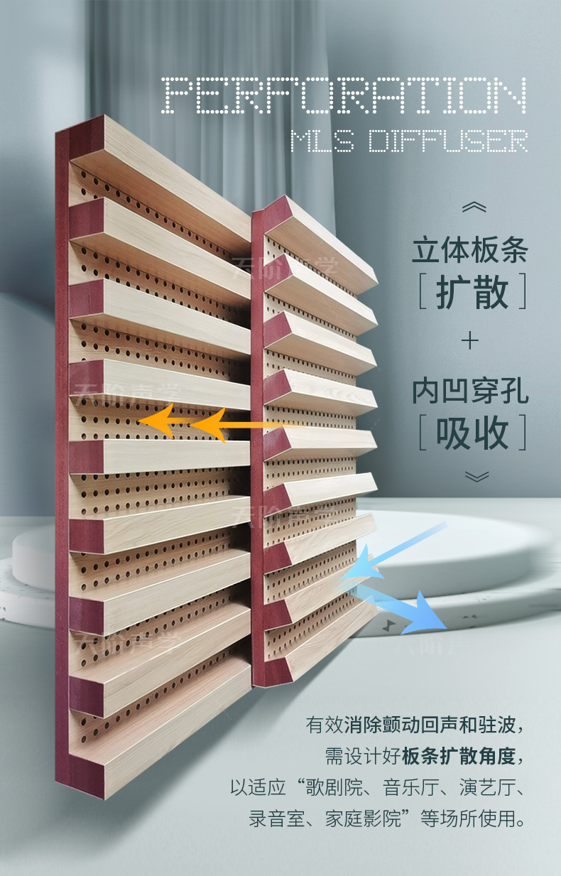 擴(kuò)散是指聲音朝著許多方向不規(guī)則反射、折射和衍射的現(xiàn)象。擴(kuò)散對“豐滿度”、“活躍度”、“空間感”是有利的,并且能保持豐滿和明晰度之間的平衡,語言清晰度和較長混響時間之間的平衡,還可以保持觀眾廳內(nèi)音調(diào)的自然性。可以讓室內(nèi)聲能分布均勻,清除回聲等。室內(nèi)擴(kuò)散不好,音色往往很粗糙。擴(kuò)散體就是為改進(jìn)聲場擴(kuò)散性能所采用的布置,設(shè)計依據(jù)是利用不規(guī)則界面改變發(fā)射聲的波前,或者改變聲阻抗。