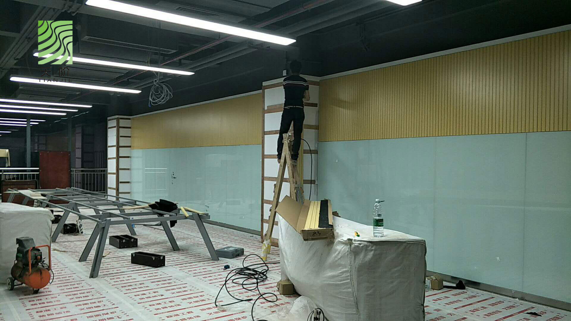 東莞藍思科技有限公司辦公室經(jīng)和多家吸音板公司對比,最終選用了天階吸音板,安裝效果圖如下: